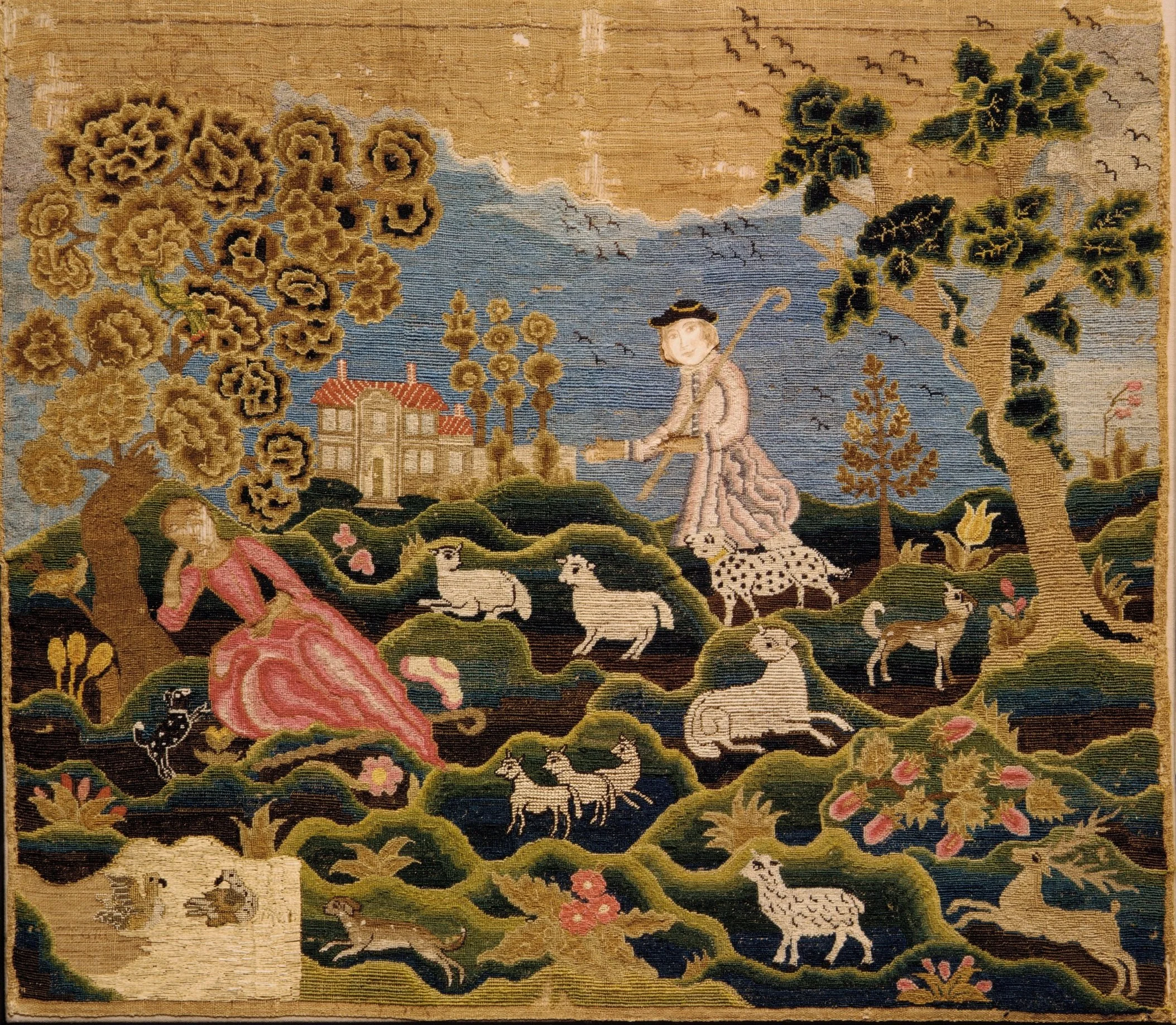 These canvaswork panels both reflect a typical style produced by girls learning embroidery in New England in the 18th century: a few humans and animals arranged on a rolling pasture, with abstract trees on the side and a house on the far horizon.