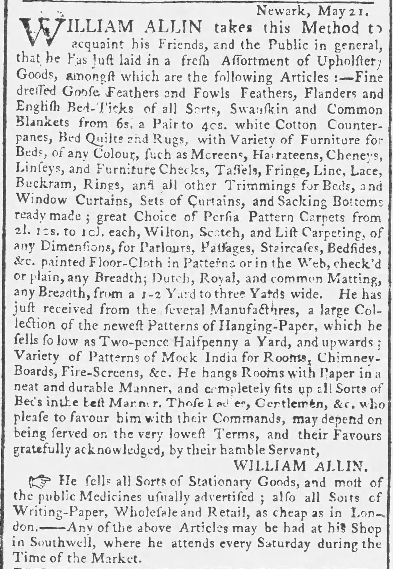 Floorcloths are also advertised in lists of imported goods in the American colonies, such as Atkins & Weston of Charleston, Balfour & Barraud of Norfolk, Joseph Beddome of Philadelphia, Robert Coudoun of Annapolis, James Drummond of Charleston, Samuel Grove of Charleston, Mackenzie, Thomson, & Co. of Charleston. The household goods in the auction of the property of Mr. George King of Montreal included “painted Floor and Stair Cloths.”