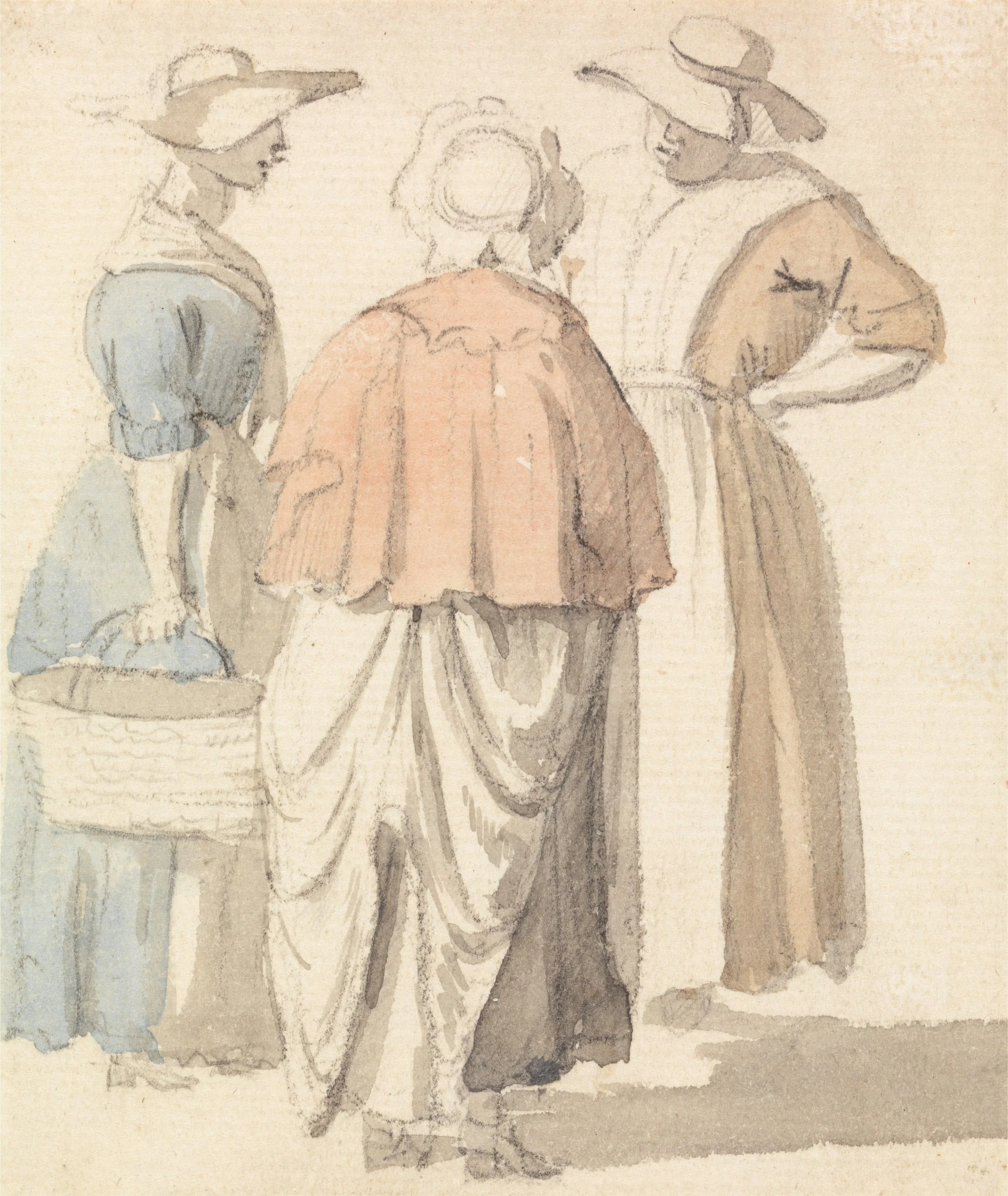 This notebook page focuses on depictions of short cloaks as worn by working-class women in the 18th century, as opposed to more fashionable styles, such as silk capuchins, mantelets, and pelisses. The cloaks in this set of links are likely to have been made from wool, are generally unlined, and often have simple collars instead of hoods.