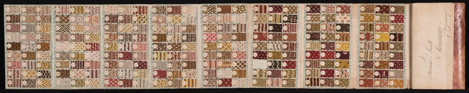 Colonial Williamsburg 1974-569, a swatch book with 430 swatches of small-scale geometric printed cottons, twill-woven cottons, tabby-woven cottons, and corded weave cottons with napped and plain finishes, Thomas Smith, Manchester, 1783